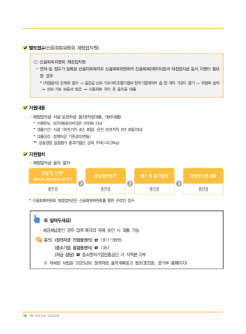 14 Re-Startup Support%ubcc4%ub3c4%uc811%uc218(%uc2e0%uc6a9%ud68c%ubcf5%uc704%uc6d0%ud68c %uc7ac%ucc3d%uc5c5%uc9c0%uc6d0)%u2460 %uc2e0%uc6a9%ud68c%ubcf5%uc704%uc6d0%ud68c %uc7ac%ucc3d%uc5c5%uc9c0%uc6d0- %uc5f0%uccb4 %ub4f1 %uc815%ubcf4%uac00 %ub4f1%ub85d%ub41c %uc2e0%uc6a9%ubbf8%ud68c%ubcf5%uc790%ub85c %uc2e0%uc6a9%ud68c%ubcf5%uc704%uc6d0%ud68c%uc758 %uc2e0%uc6a9%ud68c%ubcf5(%ucc44%ubb34%uc870%uc815)%uacfc %uc7ac%ucc3d%uc5c5%uc790%uae08 %ub3d9%uc2dc %uc9c0%uc6d0%uc774 %ud544%uc694%ud55c %uacbd%uc6b0 * (%uc9c0%uc6d0%ubc29%uc2dd) %uc2e0%ubcf5%uc704 %uc811%uc218 %u2192 %uc911%uc9c4%uacf5%u00b7%uc2e0%ubcf4%u00b7%uae30%ubcf4%u00b7NICE%ud3c9%uac00%uc815%ubcf4%u00b7%ud55c%uad6d%uae30%uc5c5%ub370%uc774%ud130 %uc911 %ud55c %uac1c%uc758 %uae30%uad00%uc774 %ud3c9%uac00 %u2192 %uc704%uc6d0%ud68c %uc2ec%uc758 %u2192 %uc2e0%ubcf4%u00b7%uae30%ubcf4 %ubcf4%uc99d%uc11c %ubc1c%uae09 %u2192 %uc2e0%uc6a9%ud68c%ubcf5 %ucc98%ub9ac %ud6c4 %uc911%uc9c4%uacf5 %ub300%ucd9c%uc9c0%uc6d0%ub0b4%uc6a9%uf09f %uc7ac%ucc3d%uc5c5%uc790%uae08 %uc2dc%uc124%u00b7%uc6b4%uc804%uc790%uae08 %uc735%uc790(%uc9c1%uc811%ub300%ucd9c, %ub300%ub9ac%ub300%ucd9c)* %uc9c0%uc6d0%ud55c%ub3c4: 60%uc5b5%uc6d0(%uc6b4%uc804%uc790%uae08%uc740 5%uc5b5%uc6d0) %uc774%ub0b4* %ub300%ucd9c%uae30%uac04: %uc2dc%uc124 10%ub144(%uac70%uce58 4%ub144 %ud3ec%ud568), %uc6b4%uc804 6%ub144(%uac70%uce58 3%ub144 %ud3ec%ud568)%uc774%ub0b4* %ub300%ucd9c%uae08%ub9ac: %uc815%ucc45%uc790%uae08 %uae30%uc900%uae08%ub9ac(%ubcc0%ub3d9)** %uc131%uc2e4%uacbd%uc601 %uc2ec%uce35%ud3c9%uac00 %ud1b5%uacfc%uae30%uc5c5%uc740 %uae08%ub9ac %uc6b0%ub300(%u22060.3%p)%uc9c0%uc6d0%uc808%ucc28%uf09f %uc7ac%ucc3d%uc5c5%uc790%uae08 %uc735%uc790 %uc808%ucc28* %uc2e0%uc6a9%ud68c%ubcf5%uc704%uc6d0%ud68c %uc7ac%ucc3d%uc5c5%uc790%uae08%uc740 %uc2e0%uc6a9%ud68c%ubcf5%uc704%uc6d0%ud68c%ub97c %ud1b5%ud55c %uc628%ub77c%uc778 %uc811%uc218%uaf2d %uc54c%uc544%ub450%uc138%uc694!%uf09f %uc138%uae08%uccb4%ub0a9%uc911%uc778 %uacbd%uc6b0 %uc555%ub958%u00b7%ub9e4%uac01%uc758 %uc720%uc608 %uc2b9%uc778 %uc2dc %ub300%ucd9c %uac00%ub2a5%ubb38%uc758: (%uc815%ucc45%uc790%uae08 %uc804%ub2f4%ucf5c%uc13c%ud130) %u260e 1811-3655(%uc911%uc18c%uae30%uc5c5 %ud1b5%ud569%ucf5c%uc13c%ud130) %u260e 1357(%uc790%uae08 %uc0c1%ub2f4) %u260e %uc911%uc18c%ubca4%ucc98%uae30%uc5c5%uc9c4%ud765%uacf5%ub2e8 %uac01 %uc9c0%uc5ed%ubcf8%u00b7%uc9c0%ubd80%u203b %uc790%uc138%ud55c %uc0ac%ud56d%uc740 2025%ub144%ub3c4 %uc815%ucc45%uc790%uae08 %uc735%uc790%uacc4%ud68d%uacf5%uace0 %ucc38%uc870(%uc911%uc9c4%uacf5, %uc911%uae30%ubd80 %ud648%ud398%uc774%uc9c0)