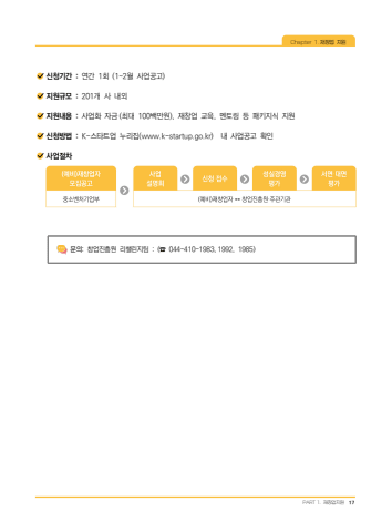 Chapter 1. %uc7ac%ucc3d%uc5c5%u00a0 %uc9c0%uc6d0PART 1. %uc7ac%ucc3d%uc5c5%uc9c0%uc6d0 17%uc2e0%uccad%uae30%uac04 : %uc5f0%uac04 1%ud68c (1~2%uc6d4 %uc0ac%uc5c5%uacf5%uace0)%uc9c0%uc6d0%uaddc%ubaa8 : 201%uac1c %uc0ac %ub0b4%uc678 %uc9c0%uc6d0%ub0b4%uc6a9 : %uc0ac%uc5c5%ud654 %uc790%uae08 (%ucd5c%ub300 100%ubc31%ub9cc%uc6d0), %uc7ac%ucc3d%uc5c5 %uad50%uc721, %uba58%ud1a0%ub9c1 %ub4f1 %ud328%ud0a4%uc9c0%uc2dd %uc9c0%uc6d0 %uc2e0%uccad%ubc29%ubc95 : K-%uc2a4%ud0c0%ud2b8%uc5c5 %ub204%ub9ac%uc9d1(www.k-startup.go.kr) %ub0b4 %uc0ac%uc5c5%uacf5%uace0 %ud655%uc778%uc0ac%uc5c5%uc808%ucc28%ubb38%uc758: %ucc3d%uc5c5%uc9c4%ud765%uc6d0 %ub9ac%ucc4c%ub9b0%uc9c0%ud300 : (%u260e 044-410-1983, 1992, 1985)