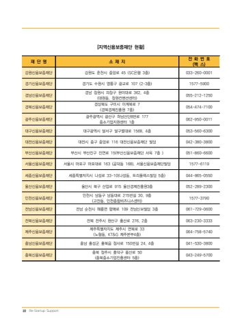 22 Re-Startup Support[%uc9c0%uc5ed%uc2e0%uc6a9%ubcf4%uc99d%uc7ac%ub2e8 %ud604%ud669]%uc7ac %ub2e8 %uba85 %uc18c %uc7ac %uc9c0 %uc804 %ud654 %ubc88 %ud638(%ud329 %uc2a4)%uac15%uc6d0%uc2e0%uc6a9%ubcf4%uc99d%uc7ac%ub2e8 %uac15%uc6d0%ub3c4 %ucd98%ucc9c%uc2dc %uc911%uc559%ub85c 45 (SC%uc740%ud589 3%uce35) 033-260-0001%uacbd%uae30%uc2e0%uc6a9%ubcf4%uc99d%uc7ac%ub2e8 %uacbd%uae30%ub3c4 %uc218%uc6d0%uc2dc %uc601%ud1b5%uad6c %uad11%uad50%ub85c 107 (2~3%uce35) 1577-5900%uacbd%ub0a8%uc2e0%uc6a9%ubcf4%uc99d%uc7ac%ub2e8 %uacbd%ub0a8 %ucc3d%uc6d0%uc2dc %uc758%ucc3d%uad6c %uc6d0%uc774%ub300%ub85c 362, 4%uce35(%ub300%uc6d0%ub3d9, %ucc3d%uc6d0%ucee8%ubca4%uc158%uc13c%ud130) 055-212-1250%uacbd%ubd81%uc2e0%uc6a9%ubcf4%uc99d%uc7ac%ub2e8 %uacbd%uc0c1%ubd81%ub3c4 %uad6c%ubbf8%uc2dc %uc774%uacc4%ubd81%ub85c 7(%uacbd%ubd81%uacbd%uc81c%uc9c4%ud765%uc6d0 7%uce35) 054-474-7100%uad11%uc8fc%uc2e0%uc6a9%ubcf4%uc99d%uc7ac%ub2e8 %uad11%uc8fc%uad11%uc5ed%uc2dc %uad11%uc0b0%uad6c %ud558%ub0a8%uc0b0%ub2e88%ubc88%ub85c 177%uc911%uc18c%uae30%uc5c5%uc9c0%uc6d0%uc13c%ud130 1%uce35 062-950-0011%ub300%uad6c%uc2e0%uc6a9%ubcf4%uc99d%uc7ac%ub2e8 %ub300%uad6c%uad11%uc5ed%uc2dc %ub2ec%uc11c%uad6c %ub2ec%uad6c%ubc8c%ub300%ub85c 1568, 4%uce35 053-560-6300%ub300%uc804%uc2e0%uc6a9%ubcf4%uc99d%uc7ac%ub2e8 %ub300%uc804%uc2dc %uc911%uad6c %uc911%uc559%ub85c 116 %ub300%uc804%uc2e0%uc6a9%ubcf4%uc99d%uc7ac%ub2e8 %ube4c%ub529 042-380-3800%ubd80%uc0b0%uc2e0%uc6a9%ubcf4%uc99d%uc7ac%ub2e8 %ubd80%uc0b0%uc2dc %ubd80%uc0b0%uc9c4%uad6c %uc9c4%uc5f0%ub85c 15(%ubd80%uc0b0%uc2e0%uc6a9%ubcf4%uc99d%uc7ac%ub2e8 %uc0ac%uc625 7%uce35 ) 051-860-6600%uc11c%uc6b8%uc2e0%uc6a9%ubcf4%uc99d%uc7ac%ub2e8 %uc11c%uc6b8%uc2dc %ub9c8%ud3ec%uad6c %ub9c8%ud3ec%ub300%ub85c 163 (%uacf5%ub355%ub3d9 168), %uc11c%uc6b8%uc2e0%uc6a9%ubcf4%uc99d%uc7ac%ub2e8%ube4c%ub529 1577-6119%uc138%uc885%uc2e0%uc6a9%ubcf4%uc99d%uc7ac%ub2e8 %uc138%uc885%ud2b9%ubcc4%uc790%uce58%uc2dc %ub098%uc131%ub85c 33-10(%ub098%uc131%ub3d9, %ud2b8%ub9ac%ud50c%ub809%uc2a4%ube4c%ub529 5%uce35) 044-865-0550%uc6b8%uc0b0%uc2e0%uc6a9%ubcf4%uc99d%uc7ac%ub2e8 %uc6b8%uc0b0%uc2dc %ubd81%uad6c %uc0b0%uc5c5%ub85c 915 %uc6b8%uc0b0%uacbd%uc81c%uc9c4%ud765%uc6d03%uce35 052-289-2300%uc778%ucc9c%uc2e0%uc6a9%ubcf4%uc99d%uc7ac%ub2e8 %uc778%ucc9c%uc2dc %ub0a8%ub3d9%uad6c %ub0a8%ub3d9%ub300%ub85c 215%ubc88%uae38 30, 9%uce35(%uace0%uc794%ub3d9, %uc778%ucc9c%uc885%ud569%ube44%uc988%ub2c8%uc2a4%uc13c%ud130) 1577-3790%uc804%ub0a8%uc2e0%uc6a9%ubcf4%uc99d%uc7ac%ub2e8 %uc804%ub0a8 %uc21c%ucc9c%uc2dc %ud574%ub8e1%uba74 %ud5a5%ub9e4%ub85c 109 %uc804%ub0a8%uc2e0%ubcf4%ube4c%ub529 3%uce35 061-729-0600%uc804%ubd81%uc2e0%uc6a9%ubcf4%uc99d%uc7ac%ub2e8 %uc804%ubd81 %uc804%uc8fc%uc2dc %uc644%uc0b0%uad6c %ud64d%uc0b0%ub85c 276, 2%uce35 063-230-3333%uc81c%uc8fc%uc2e0%uc6a9%ubcf4%uc99d%uc7ac%ub2e8 %uc81c%uc8fc%ud2b9%ubcc4%uc790%uce58%ub3c4 %uc81c%uc8fc%uc2dc %uc5f0%ubd81%ub85c 33(%ub178%ud615%ub3d9, KT&G %uc81c%uc8fc%ubcf8%ubd804%uce35) 064-758-5740%ucda9%ub0a8%uc2e0%uc6a9%ubcf4%uc99d%uc7ac%ub2e8 %ucda9%ub0a8 %ud64d%uc131%uad70 %ud64d%ubd81%uc74d %uccad%uc0ac%ub85c 150%ubc88%uae38 24, 4%uce35 041-530-3800%ucda9%ubd81%uc2e0%uc6a9%ubcf4%uc99d%uc7ac%ub2e8 %ucda9%ubd81 %uccad%uc8fc%uc2dc %ud765%ub355%uad6c %ud48d%uc0b0%ub85c 50(%ucda9%ubd81%uc911%uc18c%uae30%uc5c5%uc9c4%ud765%uc13c%ud130 5%uce35) 043-249-5700