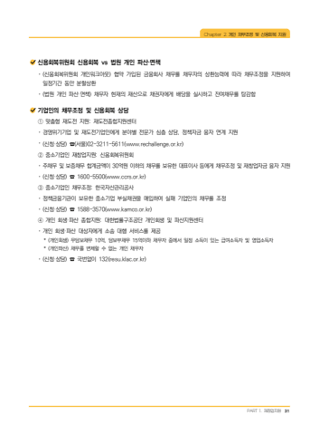 Chapter 2. %uac1c%uc778%u00a0 %ucc44%ubb34%uc870%uc815%u00a0 %ubc0f%u00a0 %uc2e0%uc6a9%ud68c%ubcf5%u00a0 %uc9c0%uc6d0PART 1. %uc7ac%ucc3d%uc5c5%uc9c0%uc6d0 31%uc2e0%uc6a9%ud68c%ubcf5%uc704%uc6d0%ud68c %uc2e0%uc6a9%ud68c%ubcf5 vs %ubc95%uc6d0 %uac1c%uc778 %ud30c%uc0b0%u00b7%uba74%ucc45%uf09f (%uc2e0%uc6a9%ud68c%ubcf5%uc704%uc6d0%ud68c %uac1c%uc778%uc6cc%ud06c%uc544%uc6c3) %ud611%uc57d %uac00%uc785%ub41c %uae08%uc735%ud68c%uc0ac %ucc44%ubb34%ub97c %ucc44%ubb34%uc790%uc758 %uc0c1%ud658%ub2a5%ub825%uc5d0 %ub530%ub77c %ucc44%ubb34%uc870%uc815%uc744 %uc9c0%uc6d0%ud558%uc5ec %uc77c%uc815%uae30%uac04 %ub3d9%uc548 %ubd84%ud560%uc0c1%ud658%uf09f (%ubc95%uc6d0 %uac1c%uc778 %ud30c%uc0b0%u00b7%uba74%ucc45) %ucc44%ubb34%uc790 %ud604%uc7ac%uc758 %uc7ac%uc0b0%uc73c%ub85c %ucc44%uad8c%uc790%uc5d0%uac8c %ubc30%ub2f9%uc744 %uc2e4%uc2dc%ud558%uace0 %uc794%uc5ec%ucc44%ubb34%ub97c %ud0d5%uac10%ud568%uae30%uc5c5%uc778%uc758 %ucc44%ubb34%uc870%uc815 %ubc0f %uc2e0%uc6a9%ud68c%ubcf5 %uc0c1%ub2f4%u2460 %ub9de%ucda4%ud615 %uc7ac%ub3c4%uc804 %uc9c0%uc6d0: %uc7ac%ub3c4%uc804%uc885%ud569%uc9c0%uc6d0%uc13c%ud130%uf09f %uacbd%uc601%uc704%uae30%uae30%uc5c5 %ubc0f %uc7ac%ub3c4%uc804%uae30%uc5c5%uc778%uc5d0%uac8c %ubd84%uc57c%ubcc4 %uc804%ubb38%uac00 %uc2ec%uce35 %uc0c1%ub2f4, %uc815%ucc45%uc790%uae08 %uc735%uc790 %uc5f0%uacc4 %uc9c0%uc6d0%uf09f (%uc2e0%uccad%u00b7%uc0c1%ub2f4) %u260e(%uc11c%uc6b8)02-3211-5611(www.rechallenge.or.kr)%u2461 %uc911%uc18c%uae30%uc5c5%uc778 %uc7ac%ucc3d%uc5c5%uc9c0%uc6d0: %uc2e0%uc6a9%ud68c%ubcf5%uc704%uc6d0%ud68c%uf09f %uc8fc%ucc44%ubb34 %ubc0f %ubcf4%uc99d%ucc44%ubb34 %ud569%uacc4%uae08%uc561%uc774 30%uc5b5%uc6d0 %uc774%ud558%uc758 %ucc44%ubb34%ub97c %ubcf4%uc720%ud55c %ub300%ud45c%uc774%uc0ac %ub4f1%uc5d0%uac8c %ucc44%ubb34%uc870%uc815 %ubc0f %uc7ac%ucc3d%uc5c5%uc790%uae08 %uc735%uc790 %uc9c0%uc6d0%uf09f (%uc2e0%uccad%u00b7%uc0c1%ub2f4) %u260e 1600-5500(www.ccrs.or.kr)%u2462 %uc911%uc18c%uae30%uc5c5%uc778 %ucc44%ubb34%uc870%uc815: %ud55c%uad6d%uc790%uc0b0%uad00%ub9ac%uacf5%uc0ac%uf09f %uc815%ucc45%uae08%uc735%uae30%uad00%uc774 %ubcf4%uc720%ud55c %uc911%uc18c%uae30%uc5c5 %ubd80%uc2e4%ucc44%uad8c%uc744 %ub9e4%uc785%ud558%uc5ec %uc2e4%ud328 %uae30%uc5c5%uc778%uc758 %ucc44%ubb34%ub97c %uc870%uc815%uf09f (%uc2e0%uccad%u00b7%uc0c1%ub2f4) %u260e 1588-3570(www.kamco.or.kr)%u2463 %uac1c%uc778 %ud68c%uc0dd%u00b7%ud30c%uc0b0 %uc885%ud569%uc9c0%uc6d0: %ub300%ud55c%ubc95%ub960%uad6c%uc870%uacf5%ub2e8 %uac1c%uc778%ud68c%uc0dd %ubc0f %ud30c%uc0b0%uc9c0%uc6d0%uc13c%ud130%uf09f %uac1c%uc778 %ud68c%uc0dd%u00b7%ud30c%uc0b0 %ub300%uc0c1%uc790%uc5d0%uac8c %uc18c%uc1a1 %ub300%ud589 %uc11c%ube44%uc2a4%ub97c %uc81c%uacf5* (%uac1c%uc778%ud68c%uc0dd) %ubb34%ub2f4%ubcf4%ucc44%ubb34 10%uc5b5, %ub2f4%ubcf4%ubd80%ucc44%ubb34 15%uc5b5%uc774%ud558 %ucc44%ubb34%uc790 %uc911%uc5d0%uc11c %uc77c%uc815 %uc18c%ub4dd%uc774 %uc788%ub294 %uae09%uc5ec%uc18c%ub4dd%uc790 %ubc0f %uc601%uc5c5%uc18c%ub4dd%uc790* (%uac1c%uc778%ud30c%uc0b0) %ucc44%ubb34%ub97c %ubcc0%uc81c%ud560 %uc218 %uc5c6%ub294 %uac1c%uc778 %ucc44%ubb34%uc790%uf09f (%uc2e0%uccad%u00b7%uc0c1%ub2f4) %u260e %uad6d%ubc88%uc5c6%uc774 132(resu.klac.or.kr)