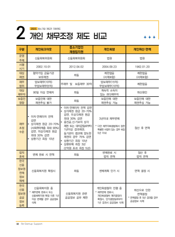32 Re-Startup Support2 %uac1c%uc778%u00a0 %ucc44%ubb34%uc870%uc815%u00a0 %uc81c%ub3c4%u00a0 %ube44%uad502025 %uc911%uc18c%uae30%uc5c5%u00a0 %uc7ac%ub3c4%uc804%u00a0 %uc9c0%uc6d0%uc81c%ub3c4%uad6c%ubd84 %uac1c%uc778%uc6cc%ud06c%uc544%uc6c3 %uc911%uc18c%uae30%uc5c5%uc778 %uc7ac%ucc3d%uc5c5%uc9c0%uc6d0 %uac1c%uc778%ud68c%uc0dd %uac1c%uc778%ud30c%uc0b0%u00b7%uba74%ucc45%uc6b4%uc601%uc8fc%uccb4 %uc2e0%uc6a9%ud68c%ubcf5%uc704%uc6d0%ud68c %uc2e0%uc6a9%ud68c%ubcf5%uc704%uc6d0%ud68c %ubc95%uc6d0 %ubc95%uc6d0%uc2dc%ud589%uc2dc%uae30 2002.10.01 2012.04.02 2004.09.23 1962.01.20%ub300%uc0c1%ucc44%uad8c%ud611%uc57d%uac00%uc785 %uae08%uc735%uae30%uad00%ubcf4%uc720%ucc44%uad8c %uc88c%ub3d9 %uc81c%ud55c%uc5c6%uc74c(%uc0ac%ucc44%ud3ec%ud568)%uc81c%ud55c%uc5c6%uc74c(%uc0ac%ucc44%ud3ec%ud568)%ucc44%ubb34%ubc94%uc704%ub2f4%ubcf4%ucc44%ubb34(10%uc5b5)%ubb34%ub2f4%ubcf4%ucc44%ubb34(5%uc5b5) %uc8fc%ucc44%ubb34 %ubc0f %ubcf4%uc99d%ucc44%ubb34 30%uc5b5 %ub2f4%ubcf4%ucc44%ubb34(15%uc5b5)%ubb34%ub2f4%ubcf4%ucc44%ubb34(10%uc5b5) %uc81c%ud55c%uc5c6%uc74c%ub300%uc0c1%ucc44%ubb34%uc790 90%uc77c %uc774%uc0c1 %uc5f0%uccb4%uc790 %uc88c%ub3d9 %uacc4%uc18d%uc801 %uc18c%ub4dd%uc774 %uc788%ub294 %uacfc%ub2e4%ucc44%ubb34%uc790 %ud30c%uc0b0%uc6d0%uc778%ubcf4%uc99d%uc778%uc601%ud5a5%ubcf4%uc99d%uc778%uc5d0 %ub300%ud55c%ucc44%uad8c%ucd94%uc2ec %ubd88%uac00 %uc88c%ub3d9 %ubcf4%uc99d%uc778%uc5d0 %ub300%ud55c %ucc44%uad8c%ucd94%uc2ec %uac00%ub2a5%ubcf4%uc99d%uc778%uc5d0 %ub300%ud55c%ucc44%uad8c%ucd94%uc2ec %uac00%ub2a5%ucc44%ubb34%uc870%uc815 %uc218%uc900%uf0a7 %uc774%uc790%u00b7%uc5f0%uccb4%uc774%uc790 %uc804%uc561 %uac10%uba74%uf0a7 %uc0c1%uac01%ucc44%uad8c %uc6d0%uae08 20~70%(%uc0ac%ud68c%ucde8%uc57d%uacc4%uce35 %ucd5c%ub300 90%) %uac10%uba74, %ubbf8%uc0c1%uac01%ucc44%uad8c %uc6d0%uae08 %ucd5c%ub300 30% %uac10%uba74%uf0a7 %uc0c1%ud658%uae30%uac04 %ucd5c%uc7a5 10%ub144%uf0a7 %uc774%uc790%u00b7%uc5f0%uccb4%uc774%uc790 %uc804%uc561 %uac10%uba74%uf0a7 %uc0c1%uac01%ucc44%uad8c %uc6d0%uae08 20~70% %uac10%uba74, %ubbf8%uc0c1%uac01%ucc44%uad8c %uc6d0%uae08 %ucd5c%ub300 30% %uac10%uba74%uf0a7 %uc911%uc9c4%uacf5,%uc2e0%u2024%uae30%ubcf4%uc758 %uc0c1%uac01%ucc44%uad8c %ub610%ub294 %ub300%uc9c0%uae09%uc77c%ub85c%ubd80%ud130 1%ub144%uc774%uc0c1 %uacbd%uacfc%ucc44%uad8c, %ub3d9%uae30%uad00%uc774 %ucea0%ucf54%uc5d0 %uc591%ub3c4%ud55c %ucc44%uad8c%uc758 %uacbd%uc6b0 75% %uac10%uba74%uf0a7 %uc0c1%ud658%uae30%uac04 %ucd5c%uc7a5 10%ub144%uf0a7 %uc0c1%ud658%uc720%uc608 %ucd5c%uc7a5 3%ub144(2%uc5b5%uc6d0 %ucd08%uacfc %ucd5c%uc7a5 5%ub144)3%ub144%uc774%ub0b4 %ucc44%ubb34%ubcc0%uc81c * %ub2e4%ub9cc %ucc44%ubb34%uc790%ud68c%uc0dd%ubc95%uc5d0%uc11c %uc815%ud55c %ud2b9%ubcc4%ud55c %uc0ac%uc815%uc774 %uc788%ub294 %uacbd%uc6b0 %ucd5c%uc7a5 5%ub144 %uc774%ub0b4%uccad%uc0b0 %ud6c4 %uba74%ucc45%ubc95%uc801%ud6a8%ub825 %ubcc0%uc81c %uc644%ub8cc %uc2dc %uba74%ucc45 %uc88c%ub3d9 %ubcc0%uc81c%uc644%ub8cc %uc2dc %ubc95%uc801 %uba74%ucc45%uccad%uc0b0 %ud6c4 %ubc95%uc801 %uba74%ucc45%ud55c%uad6d%uc2e0%uc6a9%uc815%ubcf4%uc6d0 %uc5f0%uccb4%uc815%ubcf4 %ud574%uc81c%uc2e0%uc6a9%ud68c%ubcf5%uc9c0%uc6d0 %ud655%uc815%uc2dc %uc88c%ub3d9 %ubcc0%uc81c%uacc4%ud68d %uc778%uac00 %uc2dc %uba74%ucc45 %uacb0%uc815 %uc2dc%ud55c%uad6d%uc2e0%uc6a9%uc815%ubcf4%uc6d0%uacf5%uacf5%uc815%ubcf4 %ub4f1%ub85d%uc2e0%uc6a9%ud68c%ubcf5%uc9c0%uc6d0 %uc911* %ucc44%ubb34%ubcc0%uc81c %uc644%ub8cc%uc2dc %ub610%ub294 %uc2e0%uc6a9%ud68c%ubcf5%uc9c0%uc6d0 %ud655%uc815 %uc774%ud6c4 1%ub144 %uc774%uc0c1 %ubcc0%uc81c%ud560 %uacbd%uc6b0 %uacf5%uacf5%uc815%ubcf4 %uc0ad%uc81c%uc2e0%uc6a9%ud68c%ubcf5%uc9c0%uc6d0 %uad00%ub828 %uacf5%uacf5%uc815%ubcf4 %uacf5%uc720 %uc81c%ud55c%uac1c%uc778%ud68c%uc0dd%uc808%ucc28 %uc9c4%ud589 %uc911* %ucc44%ubb34%ubcc0%uc81c %uc644%ub8cc%uc2dc, %uac1c%uc778%ud68c%uc0dd%uc808%ucc28 %ud3d0%uc9c0%uacb0%uc815%uc774 %ud655%uc815%uc2dc, %uc778%uac00%uacb0%uc815%uc77c%ub85c%ubd80%ud130 1%ub144 %uacbd%uacfc%uc2dc %uacf5%uacf5%uc815%ubcf4 %uc0ad%uc81c%ud30c%uc0b0%uc73c%ub85c %uc778%ud55c%uba74%ucc45%uacb0%uc815* %uba74%ucc45%uacb0%uc815 %ud6c4 5%ub144 %uacbd%uacfc%ud560 %uacbd%uc6b0 %uacf5%uacf5%uc815%ubcf4 %uc0ad%uc81c
