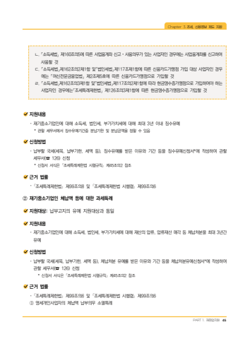 Chapter 3. %uc870%uc138,%u00a0 %uc2e0%uc6a9%uc815%ubcf4%u00a0 %uc81c%ub3c4%u00a0 %uc9c0%uc6d0PART 1. %uc7ac%ucc3d%uc5c5%uc9c0%uc6d0 45%uc9c0%uc6d0%ub0b4%uc6a9%uf09f %uc7ac%uae30%uc911%uc18c%uae30%uc5c5%uc778%uc5d0 %ub300%ud574 %uc18c%ub4dd%uc138, %ubc95%uc778%uc138, %ubd80%uac00%uac00%uce58%uc138%uc5d0 %ub300%ud574 %ucd5c%ub300 3%ub144 %uc774%ub0b4 %uc9d5%uc218%uc720%uc608* %uad00%ud560 %uc138%ubb34%uc11c%uc5d0%uc11c %uc9d5%uc218%uc720%uc608%uae30%uac04%uc911 %ubd84%ub0a9%uae30%ud55c %ubc0f %ubd84%ub0a9%uae08%uc561%uc744 %uc815%ud560 %uc218 %uc788%uc74c%uc2e0%uccad%ubc29%ubc95%uf09f %ub0a9%ubd80%ud560 %uad6d%uc138(%uc138%ubaa9, %ub0a9%ubd80%uae30%ud55c, %uc138%uc561 %ub4f1), %uc9d5%uc218%uc720%uc608%ub97c %ubc1b%uc740 %uc774%uc720%uc640 %uae30%uac04 %ub4f1%uc744 %uc9d5%uc218%uc720%uc608%uc2e0%uccad%uc11c*%uc5d0 %uc791%uc131%ud558%uc5ec %uad00%ud560 %uc138%ubb34%uc11c(%u260e 126) %uc2e0%uccad* %uc2e0%uccad%uc11c %uc11c%uc2dd%uc740 %uff62%uc870%uc138%ud2b9%ub840%uc81c%ud55c%ubc95 %uc2dc%ud589%uaddc%uce59%uff63 %uc81c45%uc870%uc7582 %ucc38%uc870%uadfc%uac70 %ubc95%ub960%uf09f %uff62%uc870%uc138%ud2b9%ub840%uc81c%ud55c%ubc95%uff63 %uc81c99%uc870%uc7588 %ubc0f %uff62%uc870%uc138%ud2b9%ub840%uc81c%ud55c%ubc95 %uc2dc%ud589%ub839%uff63 %uc81c99%uc870%uc7586%u2461 %uc7ac%uae30%uc911%uc18c%uae30%uc5c5%uc778 %uccb4%ub0a9%uc561 %ub4f1%uc5d0 %ub300%ud55c %uacfc%uc138%ud2b9%ub840%uc9c0%uc6d0%ub300%uc0c1: %ub0a9%ubd80%uace0%uc9c0%uc758 %uc720%uc608 %uc9c0%uc6d0%ub300%uc0c1%uacfc %ub3d9%uc77c%uc9c0%uc6d0%ub0b4%uc6a9%uf09f %uc7ac%uae30%uc911%uc18c%uae30%uc5c5%uc778%uc5d0 %ub300%ud574 %uc18c%ub4dd%uc138, %ubc95%uc778%uc138, %ubd80%uac00%uac00%uce58%uc138%uc5d0 %ub300%ud574 %uc7ac%uc0b0%uc758 %uc555%ub958, %uc555%ub958%uc7ac%uc0b0 %ub9e4%uac01 %ub4f1 %uccb4%ub0a9%ucc98%ubd84%uc744 %ucd5c%ub300 3%ub144%uac04 %uc720%uc608%uc2e0%uccad%ubc29%ubc95%uf09f %ub0a9%ubd80%ud560 %uad6d%uc138(%uc138%ubaa9, %ub0a9%ubd80%uae30%ud55c, %uc138%uc561 %ub4f1), %uccb4%ub0a9%ucc98%ubd84 %uc720%uc608%ub97c %ubc1b%uc740 %uc774%uc720%uc640 %uae30%uac04 %ub4f1%uc744 %uccb4%ub0a9%ucc98%ubd84%uc720%uc608%uc2e0%uccad%uc11c*%uc5d0 %uc791%uc131%ud558%uc5ec %uad00%ud560 %uc138%ubb34%uc11c(%u260e 126) %uc2e0%uccad * %uc2e0%uccad%uc11c %uc11c%uc2dd%uc740 %uff62%uc870%uc138%ud2b9%ub840%uc81c%ud55c%ubc95 %uc2dc%ud589%uaddc%uce59%uff63 %uc81c45%uc870%uc7582 %ucc38%uc870%uadfc%uac70 %ubc95%ub960%uf09f %uff62%uc870%uc138%ud2b9%ub840%uc81c%ud55c%ubc95%uff63 %uc81c99%uc870%uc7586 %ubc0f %uff62%uc870%uc138%ud2b9%ub840%uc81c%ud55c%ubc95 %uc2dc%ud589%ub839%uff63 %uc81c99%uc870%uc7586%u2462 %uc601%uc138%uac1c%uc778%uc0ac%uc5c5%uc790%uc758 %uccb4%ub0a9%uc561 %ub0a9%ubd80%uc758%ubb34 %uc18c%uba78%ud2b9%ub840 %u3134. %u300c%uc18c%ub4dd%uc138%ubc95%u300d %uc81c160%uc870%uc7585%uc5d0 %ub530%ub978 %uc0ac%uc5c5%uc6a9%uacc4%uc88c %uc2e0%uace0%u22c5%uc0ac%uc6a9%uc758%ubb34%uac00 %uc788%ub294 %uc0ac%uc5c5%uc790%uc778 %uacbd%uc6b0%uc5d0%ub294 %uc0ac%uc5c5%uc6a9%uacc4%uc88c%ub97c %uc2e0%uace0%ud558%uc5ec %uc0ac%uc6a9%ud560 %uac83 %u3137. %u300c%uc18c%ub4dd%uc138%ubc95%u300d%uc81c162%uc870%uc7582%uc81c1%ud56d %ubc0f%u300c%ubc95%uc778%uc138%ubc95%u300d%uc81c117%uc870%uc81c1%ud56d%uc5d0 %ub530%ub978 %uc2e0%uc6a9%uce74%ub4dc%uac00%ub9f9%uc810 %uac00%uc785 %ub300%uc0c1 %uc0ac%uc5c5%uc790%uc778 %uacbd%uc6b0%uc5d0%ub294 %u300c%uc5ec%uc2e0%uc804%ubb38%uae08%uc735%uc5c5%ubc95%u300d %uc81c2%uc870%uc81c5%ud638%uc5d0 %ub530%ub978 %uc2e0%uc6a9%uce74%ub4dc%uac00%ub9f9%uc810%uc73c%ub85c %uac00%uc785%ud560 %uac83 %u3139. %u300c%uc18c%ub4dd%uc138%ubc95%u300d%uc81c162%uc870%uc7583%uc81c1%ud56d %ubc0f%u300c%ubc95%uc778%uc138%ubc95%u300d%uc81c117%uc870%uc7582%uc81c1%ud56d%uc5d0 %ub530%ub77c %ud604%uae08%uc601%uc218%uc99d%uac00%ub9f9%uc810%uc73c%ub85c %uac00%uc785%ud558%uc5ec%uc57c %ud558%ub294 %uc0ac%uc5c5%uc790%uc778 %uacbd%uc6b0%uc5d0%ub294%u300c%uc870%uc138%ud2b9%ub840%uc81c%ud55c%ubc95%u300d %uc81c126%uc870%uc7583%uc81c1%ud56d%uc5d0 %ub530%ub978 %ud604%uae08%uc601%uc218%uc99d%uac00%ub9f9%uc810%uc73c%ub85c %uac00%uc785%ud560 %uac83