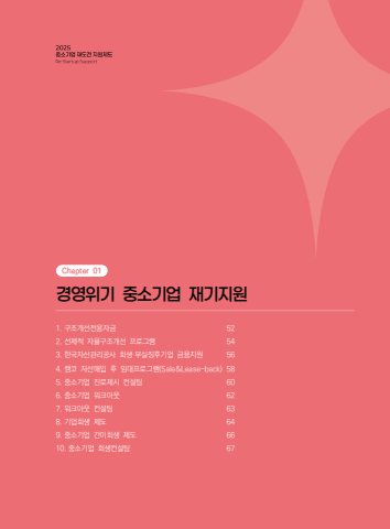 Chapter 01%uacbd%uc601%uc704%uae30%u00a0 %uc911%uc18c%uae30%uc5c5%u00a0 %uc7ac%uae30%uc9c0%uc6d01. %uad6c%uc870%uac1c%uc120%uc804%uc6a9%uc790%uae08 522. %uc120%uc81c%uc801 %uc790%uc728%uad6c%uc870%uac1c%uc120 %ud504%ub85c%uadf8%ub7a8 543. %ud55c%uad6d%uc790%uc0b0%uad00%ub9ac%uacf5%uc0ac %ud68c%uc0dd%u00b7%ubd80%uc2e4%uc9d5%ud6c4%uae30%uc5c5 %uae08%uc735%uc9c0%uc6d0 564. %ucea0%ucf54 %uc790%uc0b0%ub9e4%uc785 %ud6c4 %uc784%ub300%ud504%ub85c%uadf8%ub7a8(Sale&Lease-back) 585. %uc911%uc18c%uae30%uc5c5 %uc9c4%ub85c%uc81c%uc2dc %ucee8%uc124%ud305 606. %uc911%uc18c%uae30%uc5c5 %uc6cc%ud06c%uc544%uc6c3 627. %uc6cc%ud06c%uc544%uc6c3 %ucee8%uc124%ud305 638. %uae30%uc5c5%ud68c%uc0dd %uc81c%ub3c4 649. %uc911%uc18c%uae30%uc5c5 %uac04%uc774%ud68c%uc0dd %uc81c%ub3c4 6610. %uc911%uc18c%uae30%uc5c5 %ud68c%uc0dd%ucee8%uc124%ud305 67