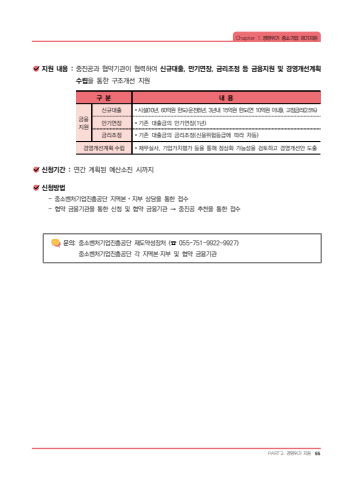 Chapter 1. %uacbd%uc601%uc704%uae30%u00a0 %uc911%uc18c%uae30%uc5c5%u00a0 %uc7ac%uae30%uc9c0%uc6d0PART 2. %uacbd%uc601%uc704%uae30 %uc9c0%uc6d0 55%uc9c0%uc6d0 %ub0b4%uc6a9 : %uc911%uc9c4%uacf5%uacfc %ud611%uc57d%uae30%uad00%uc774 %ud611%ub825%ud558%uc5ec %uc2e0%uaddc%ub300%ucd9c, %ub9cc%uae30%uc5f0%uc7a5, %uae08%ub9ac%uc870%uc815 %ub4f1 %uae08%uc735%uc9c0%uc6d0 %ubc0f %uacbd%uc601%uac1c%uc120%uacc4%ud68d %uc218%ub9bd%uc744 %ud1b5%ud55c %uad6c%uc870%uac1c%uc120 %uc9c0%uc6d0%uad6c %ubd84 %ub0b4 %uc6a9%uae08%uc735%uc9c0%uc6d0%uc2e0%uaddc%ub300%ucd9c %u2023%uc2dc%uc124(10%ub144, 60%uc5b5%uc6d0 %ud55c%ub3c4)%u00b7%uc6b4%uc804(5%ub144, 3%ub144%ub0b4 15%uc5b5%uc6d0 %ud55c%ub3c4(%uc5f0 10%uc5b5%uc6d0 %uc774%ub0b4)), %uace0%uc815%uae08%ub9ac(2.5%)%ub9cc%uae30%uc5f0%uc7a5 %u2023 %uae30%uc874 %ub300%ucd9c%uae08%uc758 %ub9cc%uae30%uc5f0%uc7a5(1%ub144)%uae08%ub9ac%uc870%uc815 %u2023 %uae30%uc874 %ub300%ucd9c%uae08%uc758 %uae08%ub9ac%uc870%uc815(%uc2e0%uc6a9%uc704%ud5d8%ub4f1%uae09%uc5d0 %ub530%ub77c %ucc28%ub4f1)%uacbd%uc601%uac1c%uc120%uacc4%ud68d %uc218%ub9bd %u2023 %uc7ac%ubb34%uc2e4%uc0ac, %uae30%uc5c5%uac00%uce58%ud3c9%uac00 %ub4f1%uc744 %ud1b5%ud574 %uc815%uc0c1%ud654 %uac00%ub2a5%uc131%uc744 %uac80%ud1a0%ud558%uace0 %uacbd%uc601%uac1c%uc120%uc548 %ub3c4%ucd9c%uc2e0%uccad%uae30%uac04 : %uc5f0%uac04 %uacc4%ud68d%ub41c %uc608%uc0b0%uc18c%uc9c4 %uc2dc%uae4c%uc9c0%uc2e0%uccad%ubc29%ubc95- %uc911%uc18c%ubca4%ucc98%uae30%uc5c5%uc9c4%ud765%uacf5%ub2e8 %uc9c0%uc5ed%ubcf8%u22c5%uc9c0%ubd80 %uc0c1%ub2f4%uc744 %ud1b5%ud55c %uc811%uc218- %ud611%uc57d %uae08%uc735%uae30%uad00%uc744 %ud1b5%ud55c %uc2e0%uccad %ubc0f %ud611%uc57d %uae08%uc735%uae30%uad00 %u2192 %uc911%uc9c4%uacf5 %ucd94%ucc9c%uc744 %ud1b5%ud55c %uc811%uc218%ubb38%uc758: %uc911%uc18c%ubca4%ucc98%uae30%uc5c5%uc9c4%ud765%uacf5%ub2e8 %uc7ac%ub3c4%uc57d%uc131%uc7a5%ucc98 (%u260e 055-751-9922~9927)%uc911%uc18c%ubca4%ucc98%uae30%uc5c5%uc9c4%ud765%uacf5%ub2e8 %uac01 %uc9c0%uc5ed%ubcf8%u00b7%uc9c0%ubd80 %ubc0f %ud611%uc57d %uae08%uc735%uae30%uad00