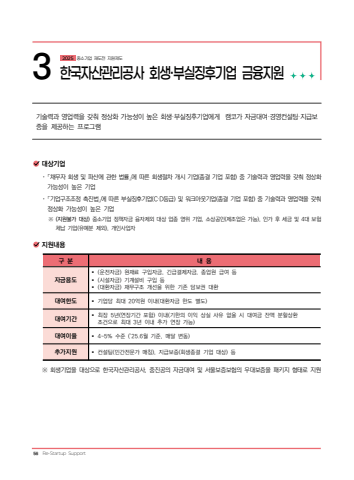 56 Re-Startup Support3 %ud55c%uad6d%uc790%uc0b0%uad00%ub9ac%uacf5%uc0ac%u00a0 %ud68c%uc0dd%u00b7%ubd80%uc2e4%uc9d5%ud6c4%uae30%uc5c5%u00a0 %uae08%uc735%uc9c0%uc6d02025 %uc911%uc18c%uae30%uc5c5%u00a0 %uc7ac%ub3c4%uc804%u00a0 %uc9c0%uc6d0%uc81c%ub3c4%uae30%uc220%ub825%uacfc %uc601%uc5c5%ub825%uc744 %uac16%ucdb0 %uc815%uc0c1%ud654 %uac00%ub2a5%uc131%uc774 %ub192%uc740 %ud68c%uc0dd%u00b7%ubd80%uc2e4%uc9d5%ud6c4%uae30%uc5c5%uc5d0%uac8c %ucea0%ucf54%uac00 %uc790%uae08%ub300%uc5ec%u00b7%uacbd%uc601%ucee8%uc124%ud305%u00b7%uc9c0%uae09%ubcf4%uc99d%uc744 %uc81c%uacf5%ud558%ub294 %ud504%ub85c%uadf8%ub7a8%ub300%uc0c1%uae30%uc5c5%uf09f %u300c%ucc44%ubb34%uc790 %ud68c%uc0dd %ubc0f %ud30c%uc0b0%uc5d0 %uad00%ud55c %ubc95%ub960%u300d%uc5d0 %ub530%ub978 %ud68c%uc0dd%uc808%ucc28 %uac1c%uc2dc %uae30%uc5c5(%uc885%uacb0 %uae30%uc5c5 %ud3ec%ud568) %uc911 %uae30%uc220%ub825%uacfc %uc601%uc5c5%ub825%uc744 %uac16%ucdb0 %uc815%uc0c1%ud654 %uac00%ub2a5%uc131%uc774 %ub192%uc740 %uae30%uc5c5%uf09f %u300c%uae30%uc5c5%uad6c%uc870%uc870%uc815 %ucd09%uc9c4%ubc95%u300d%uc5d0 %ub530%ub978 %ubd80%uc2e4%uc9d5%ud6c4%uae30%uc5c5(C%u00b7D%ub4f1%uae09) %ubc0f %uc6cc%ud06c%uc544%uc6c3%uae30%uc5c5(%uc885%uacb0 %uae30%uc5c5 %ud3ec%ud568) %uc911 %uae30%uc220%ub825%uacfc %uc601%uc5c5%ub825%uc744 %uac16%ucdb0 %uc815%uc0c1%ud654 %uac00%ub2a5%uc131%uc774 %ub192%uc740 %uae30%uc5c5%u203b (%uc9c0%uc6d0%ubd88%uac00 %ub300%uc0c1) %uc911%uc18c%uae30%uc5c5 %uc815%ucc45%uc790%uae08 %uc735%uc790%uc81c%uc678 %ub300%uc0c1 %uc5c5%uc885 %uc601%uc704 %uae30%uc5c5, %uc18c%uc0c1%uacf5%uc778(%uc81c%uc870%uc5c5%uc740 %uac00%ub2a5), %uc778%uac00 %ud6c4 %uc138%uae08 %ubc0f 4%ub300 %ubcf4%ud5d8 %uccb4%ub0a9 %uae30%uc5c5(%uc720%uc608%ubd84 %uc81c%uc678), %uac1c%uc778%uc0ac%uc5c5%uc790%uc9c0%uc6d0%ub0b4%uc6a9%uad6c %ubd84 %ub0b4 %uc6a9%uc790%uae08%uc6a9%ub3c4%uf0a7 (%uc6b4%uc804%uc790%uae08) %uc6d0%uc7ac%ub8cc %uad6c%uc785%uc790%uae08, %uae34%uae09%uacb0%uc81c%uc790%uae08, %uc885%uc5c5%uc6d0 %uae09%uc5ec %ub4f1%uf0a7 (%uc2dc%uc124%uc790%uae08) %uae30%uacc4%uc124%ube44 %uad6c%uc785 %ub4f1%uf0a7 (%ub300%ud658%uc790%uae08) %uc7ac%ubb34%uad6c%uc870 %uac1c%uc120%uc744 %uc704%ud55c %uae30%uc874 %ub2f4%ubcf4%uad8c %ub300%ud658%ub300%uc5ec%ud55c%ub3c4 %uf0a7 %uae30%uc5c5%ub2f9 %ucd5c%ub300 20%uc5b5%uc6d0 %uc774%ub0b4(%ub300%ud658%uc790%uae08 %ud55c%ub3c4 %ubcc4%ub3c4)%ub300%uc5ec%uae30%uac04 %uf0a7 %ucd5c%uc7a5 5%ub144(%uc5f0%uc7a5%uae30%uac04 %ud3ec%ud568) %uc774%ub0b4(%uae30%ud55c%uc758 %uc774%uc775 %uc0c1%uc2e4 %uc0ac%uc720 %uc5c6%uc744 %uc2dc %ub300%uc5ec%uae08 %uc794%uc561 %ubd84%ud560%uc0c1%ud658 %uc870%uac74%uc73c%ub85c %ucd5c%ub300 3%ub144 %uc774%ub0b4 %ucd94%uac00 %uc5f0%uc7a5 %uac00%ub2a5)%ub300%uc5ec%uc774%uc728 %uf0a7 4~5% %uc218%uc900 (%u201925.6%uc6d4 %uae30%uc900, %ub9e4%ub2ec %ubcc0%ub3d9)%ucd94%uac00%uc9c0%uc6d0 %uf0a7 %ucee8%uc124%ud305(%ubbfc%uac04%uc804%ubb38%uac00 %ub9e4%uce6d), %uc9c0%uae09%ubcf4%uc99d(%ud68c%uc0dd%uc885%uacb0 %uae30%uc5c5 %ub300%uc0c1) %ub4f1%u203b %ud68c%uc0dd%uae30%uc5c5%uc744 %ub300%uc0c1%uc73c%ub85c %ud55c%uad6d%uc790%uc0b0%uad00%ub9ac%uacf5%uc0ac, %uc911%uc9c4%uacf5%uc758 %uc790%uae08%ub300%uc5ec %ubc0f %uc11c%uc6b8%ubcf4%uc99d%ubcf4%ud5d8%uc758 %uc6b0%ub300%ubcf4%uc99d%uc744 %ud328%ud0a4%uc9c0 %ud615%ud0dc%ub85c %uc9c0%uc6d0