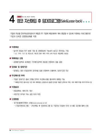 58 Re-Startup Support4 %ucea0%ucf54%u00a0 %uc790%uc0b0%ub9e4%uc785%u00a0 %ud6c4%u00a0 %uc784%ub300%ud504%ub85c%uadf8%ub7a8(Sale&Lease-back)2025 %uc911%uc18c%uae30%uc5c5%u00a0 %uc7ac%ub3c4%uc804%u00a0 %uc9c0%uc6d0%uc81c%ub3c4%uae30%uc5c5%uc758 %uc790%uc0b0%uc744 %ud55c%uad6d%uc790%uc0b0%uad00%ub9ac%uacf5%uc0ac%uac00 %ub9e4%uc785%ud55c %ud6c4 %uae30%uc5c5%uc5d0 %uc7ac%uc784%ub300%ud558%uc5ec %uacc4%uc18d %uc601%uc5c5%ud560 %uc218 %uc788%ub3c4%ub85d %uc9c0%uc6d0%ud558%ub294 %ud504%ub85c%uadf8%ub7a8%uc73c%ub85c %uae30%uc5c5%uc758 %uc2e0%uc18d%ud55c %uacbd%uc601%uc815%uc0c1%ud654%ub97c %uc9c0%uc6d0%uc9c0%uc6d0%ub300%uc0c1%uf09f %uc77c%uc2dc%uc801 %uc720%ub3d9%uc131 %uc704%uae30 %ubc1c%uc0dd %uae30%uc5c5 %uc911 %uacbd%uc601%uc815%uc0c1%ud654 %uac00%ub2a5%uc131%uc774 %ub192%ub2e4%uace0 %ud310%ub2e8%ub418%ub294 %uae30%uc5c5* %ub2e8, %uae30%uacc4%u22c5%uae30%uad6c %ubc0f %uac1c%uc778%uc18c%uc720, %uc7ac%uc0b0%uad8c %ud589%uc0ac %uc81c%uc57d %uc9c0%uc5ed %uc18c%uc7ac %uc790%uc0b0%uc740 %ub9e4%uc785%uc81c%ud55c %ub300%uc0c1%uc784%ub9e4%ub9e4%ub300%uae08 %uc0b0%uc815%uf09f %uac10%uc815%ud3c9%uac00%uae08%uc561%uacfc %ud68c%uacc4%ubc95%uc778 %uac00%uce58%ud3c9%uac00%uae08%uc561%uc758 %ud3c9%uade0%uc744 %ubc18%uc601%ud558%uc5ec %ucd5c%uc885 %uacb0%uc815%uc784%ub300%ub8cc %ubc0f %uc784%ub300%uae30%uac04%uf09f %uc784%ub300%ub8cc%ub294 %ucea0%ucf54 %uc870%ub2ec%uae08%ub9ac%uc640 %uad00%ub9ac%ube44%uc6a9 %ub4f1%uc744 %ubc18%uc601%ud558%uc5ec %uc0b0%ucd9c%ud558%uba70, %uc784%ub300%uae30%uac04%uc740 5%ub144%uc6b0%uc120%ub9e4%uc218%uad8c %ubd80%uc5ec %uf09f %uae30%uc5c5%uc740 %uc784%ub300%uae30%uac04 %uc885%ub8cc 3%uac1c%uc6d4 %uc804%uae4c%uc9c0 %uc6b0%uc120%ub9e4%uc218%uad8c%uc744 %ud589%uc0ac%ud558%uc5ec %uc7ac%ub9e4%uc785 %uac00%ub2a5* %uc7ac%ub9e4%uc785%uac00%uaca9%uc740 %ud589%uc0ac%uc2dc%uc810 %uae30%uc900 %ucd5c%ucd08 %ub9e4%ub9e4%ub300%uae08 %uc0b0%uc815%ubc29%uc2dd%uacfc %ub3d9%uc77c%ud55c %ubc29%uc2dd%uc744 %uc801%uc6a9%ud55c %uae08%uc561%uc73c%ub85c %ud558%ub418, %ucd5c%ucd08 %ub9e4%ub9e4%uac00%uaca9%uc744 %ucd5c%uc800%uac00%uaca9%uc73c%ub85c %ud568%uc9c0%uc6d0%ud6a8%uacfc%uf09f %uc720%ub3d9%uc131%ud655%ubcf4, %uc7ac%ubb34%uad6c%uc870 %uac1c%uc120%uf09f %uc0ac%uc5c5%uae30%ubc18 %uc720%uc9c0%ub85c %uc9c0%uc18d %uc131%uc7a5 %ud1a0%ub300 %ub9c8%ub828%uc2e0%uccad%ubc29%ubc95%uf09f %u2018%uc628%uae30%uc5c5%u2019%ud648%ud398%uc774%uc9c0%uc5d0%uc11c %uc2e0%uccad(www.oncorp.or.kr)- [%uae30%uc5c5%uc9c0%uc6d0%ud504%ub85c%uadf8%ub7a8] - [%uc790%uc0b0%ub9e4%uc785 %ud6c4 %uc784%ub300%ud504%ub85c%uadf8%ub7a8 %ubc0f %uae30%uc5c5%uc790%uc0b0 %uc720%ub3d9%ud654 %uc778%uc218] %ub0b4 %ubcc4%ub3c4 %ub9c1%ud06c%ub97c %ud1b5%ud574 %uc2e0%uccad