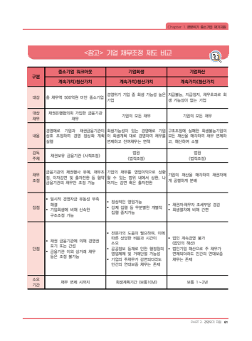Chapter 1. %uacbd%uc601%uc704%uae30%u00a0 %uc911%uc18c%uae30%uc5c5%u00a0 %uc7ac%uae30%uc9c0%uc6d0PART 2. %uacbd%uc601%uc704%uae30 %uc9c0%uc6d0 61<%ucc38%uace0> %uae30%uc5c5 %ucc44%ubb34%uc870%uc815 %uc81c%ub3c4 %ube44%uad50%uad6c%ubd84%uc911%uc18c%uae30%uc5c5 %uc6cc%ud06c%uc544%uc6c3 %uae30%uc5c5%ud68c%uc0dd %uae30%uc5c5%ud30c%uc0b0%uacc4%uc18d%uac00%uce58>%uccad%uc0b0%uac00%uce58 %uacc4%uc18d%uac00%uce58>%uccad%uc0b0%uac00%uce58 %uacc4%uc18d%uac00%uce58<%uccad%uc0b0%uac00%uce58%ub300%uc0c1 %ucd1d %ucc44%ubb34%uc561 500%uc5b5%uc6d0 %ubbf8%ub9cc %uc911%uc18c%uae30%uc5c5 %uacbd%uc601%uc704%uae30 %uae30%uc5c5 %uc911 %ud68c%uc0dd %uac00%ub2a5%uc131 %ub192%uc740 %uae30%uc5c5%uc9c0%uae09%ubd88%ub2a5, %uc9c0%uae09%uc815%uc9c0, %ucc44%ubb34%ucd08%uacfc%ub85c %ud68c%uc0dd %uac00%ub2a5%uc131%uc774 %uc5c6%ub294 %uae30%uc5c5%ub300%uc0c1 %ucc44%ubb34%ucc44%uad8c%uc740%ud589%ud611%uc758%ud68c %uac00%uc785%ud55c %uae08%uc735%uae30%uad00 %ucc44%ubb34 %uae30%uc5c5%uc758 %ubaa8%ub4e0 %ucc44%ubb34 %uae30%uc5c5%uc758 %ubaa8%ub4e0 %ucc44%ubb34%ub0b4%uc6a9%uacbd%uc601%uc560%ub85c %uae30%uc5c5%uacfc %ucc44%uad8c%uae08%uc735%uae30%uad00%uc774 %uc0c1%ud638 %uc870%uc815%ud558%uc5ec %uacbd%uc601 %uc815%uc0c1%ud654 %uacc4%ud68d %uc2e4%ud589%ud68c%uc0dd%uac00%ub2a5%uc131%uc774 %uc788%ub294 %uacbd%uc601%uc560%ub85c %uae30%uc5c5%uc774 %ud68c%uc0dd%uacc4%ud68d %ub300%ub85c %uacbd%uc601%ud558%uc5ec %ucc44%ubb34%ub97c %ubcc0%uc81c%ud558%uace0 %uc794%uc5ec%ucc44%ubb34%ub294 %uba74%ucc45%uad6c%uc870%uc870%uc815%uc5d0 %uc2e4%ud328%ud55c %ud68c%uc0dd%ubd88%ub2a5%uae30%uc5c5%uc758 %ubaa8%ub4e0 %uc7ac%uc0b0%uc744 %ub9e4%uac01%ud558%uc5ec %ucc44%ubb34 %ubcc0%uc81c%ud558%uace0, %ud574%uc0b0%ud558%uc5ec %uc18c%uba78%uac10%ub3c5%uc8fc%uccb4 %ucc44%uad8c%ubcf4%uc720 %uae08%uc735%uae30%uad00 (%uc0ac%uc801%uc870%uc815) %ubc95%uc6d0(%ubc95%uc801%uc870%uc815)%ubc95%uc6d0(%ubc95%uc801%uc870%uc815)%ucc44%ubb34%uc870%uc815%uae08%uc735%uae30%uad00%uc758 %ucc44%uad8c%ud589%uc0ac %uc720%uc608, %ucc44%ubb34%uc870%uc815, %uc774%uc790%uac10%uba74 %ubc0f %ucd9c%uc790%uc804%ud658 %ub4f1 %ud611%uc57d %uae08%uc735%uae30%uad00%uc758 %ucc44%ubb34%ub9cc %uc870%uc815 %uac00%ub2a5%uae30%uc5c5%uc758 %ucc44%ubb34%ub97c %uc601%uc5c5%uc774%uc775%uc73c%ub85c %uc0c1%ud658%ud560 %uc218 %uc788%ub294 %ubc94%uc704 %ub0b4%uc5d0%uc11c %uc0c1%ud658, %ub098%uba38%uc9c0%ub294 %uac10%uba74 %ud639%uc740 %ucd9c%uc790%uc804%ud658%uae30%uc5c5%uc758 %uc7ac%uc0b0%uc744 %ub9e4%uac01%ud558%uc5ec %ucc44%uad8c%uc790%uc5d0%uac8c %uacf5%ud3c9%ud558%uac8c %ubd84%ubc30%uc7a5%uc810%uf0a7 %uc77c%uc2dc%uc801 %uacbd%uc601%uc790%uae08 %uc720%ub3d9%uc131 %ubd80%uc871 %ud574%uacb0%uf0a7 %uae30%uc5c5%ud68c%uc0dd%uc5d0 %ube44%ud574 %uc2e0%uc18d%ud55c %uad6c%uc870%uc870%uc815 %uac00%ub2a5%uf0a7 %uc815%uc0c1%uc801%uc778 %uc601%uc5c5%uac00%ub2a5%uf0a7 %uac15%uc81c %uc9d1%ud589 %ub4f1 %ubb34%ubd84%ubcc4%ud55c %uac1c%ubcc4%uc801 %uc9d1%ud589 %uc911%uc9c0%uac00%ub2a5%uf0a7 %ucc44%uad8c%uc790%u2024%ucc44%ubb34%uc790 %uc870%uc138%ubd80%ub2f4 %uacbd%uac10%uf0a7 %ud68c%uc0dd%uc808%ucc28%uc5d0 %ube44%ud574 %uac04%ud3b8%ub2e8%uc810%uf0a7 %ucc44%uad8c %uae08%uc735%uae30%uad00%uc5d0 %uc758%ud574 %uacbd%uc601%uad8c %ud3ec%uae30 %ub610%ub294 %uac04%uc12d%uf0a7 %uae08%uc735%uae30%uad00 %uc774%uc678 %uc0c1%uac70%ub798 %ucc44%ubb34 %ub4f1%uc740 %uc870%uc815 %ubd88%uac00%ub2a5%uf0a7 %uc804%ubb38%uac00%uc758 %ub3c4%uc6c0%uc774 %ud544%uc694%ud558%uba70, %uc774%uc5d0 %ub530%ub978 %uc0c1%ub2f9%ud55c %ube44%uc6a9%uacfc %uc2dc%uac04%uc774 %uc18c%uc694%uf0a7 %uacf5%uacf5%uc815%ubcf4 %ub4f1%uc7ac%ub85c %uc778%ud55c %ud589%uc815%uccad%uc758 %uc601%uc5c5%uc81c%uc81c %ubc0f %uac70%ub798%ub2e8%uc808 %uac00%ub2a5%uc131 %uf0a7 %uae30%uc5c5%uc758 %uc8fc%ucc44%ubb34%uac00 %uac10%uba74%ub418%ub354%ub77c%ub3c4 %ubbfc%uac04%uc758 %uc5f0%ub300%ubcf4%uc99d %ucc44%ubb34%ub294 %uc874%uc7ac%uf0a7 %ubc95%uc778 %uacc4%uc18d%uacbd%uc601 %ubd88%uac00(%ubc95%uc778%uc758 %ud574%uc0b0)%uf0a7 %ubc95%uc778%uae30%uc5c5 %ud574%uc0b0%uc73c%ub85c %uc8fc %ucc44%ubb34%uac00 %uba74%uc81c%ub418%ub354%ub77c%ub3c4 %ubbfc%uac04%uc758 %uc5f0%ub300%ubcf4%uc99d %ucc44%ubb34%ub294 %uc874%uc7ac%uc18c%uc694%uae30%uac04 %ucc44%ubb34 %ubcc0%uc81c %uc2dc%uae4c%uc9c0 %ud68c%uc0dd%uacc4%ud68d%uae30%uac04 (%ubcf4%ud1b510%ub144) %ubcf4%ud1b5 1%u223c2%ub144