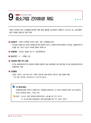 66 Re-Startup Support9 %uc911%uc18c%uae30%uc5c5%u00a0 %uac04%uc774%ud68c%uc0dd%u00a0 %uc81c%ub3c42025 %uc911%uc18c%uae30%uc5c5%u00a0 %uc7ac%ub3c4%uc804%u00a0 %uc9c0%uc6d0%uc81c%ub3c4%ubd80%ucc44%uac00 50%uc5b5%uc6d0 %ubbf8%ub9cc %uc18c%uc561%uc601%uc5c5%uc18c%ub4dd%uc790%uc5d0 %ub300%ud574 %ud68c%uc0dd %uc808%ucc28%ub97c %uac04%uc18c%ud654%ud558%uc5ec %ud68c%uc0dd%uc778%uac00 %uc18c%uc694%uae30%uac04 %ubc0f %uc18c%uc694%ube44%uc6a9%uc5d0 %ub300%ud55c %ubd80%ub2f4%uc744 %uc644%ud654%uc2dc%ud0a8 %ubc95%uc801 %uc81c%ub3c4%uc2e0%uccad%uc790%uaca9 : %ubd80%ucc44%uac00 50%uc5b5%uc6d0 %ubbf8%ub9cc%uc778 %ubc95%uc778, %uac1c%uc778 %uc18c%uc561%uc601%uc5c5%uc18c%ub4dd%uc790* %uac04%uc774%ud68c%uc0dd %uc2e0%uccad%uc744 %ud558%ub294 %ub54c%uc5d0 %uc18c%uc561%uc601%uc5c5%uc18c%ub4dd%uc790%uc5d0 %ud574%ub2f9%ud558%uc9c0 %uc54a%uac70%ub098 %uc2e0%uccad%uacb0%uaca9%uc0ac%uc720%uc5d0 %ud574%ub2f9%ud558%ub294 %uacbd%uc6b0%uc5d0%ub294 %ud68c%uc0dd%uc808%ucc28%uac1c%uc2dc%uc758 %uc2e0%uccad%uc744 %ud558%ub294 %uc758%uc0ac%uac00 %uc788%ub294%uc9c0 %uc5ec%ubd80%ub97c %uba85%ud655%ud788 %ubc1d%ud600%uc57c %ud568%uc2e0%uccad%ube44%uc6a9 : %uc778%uc9c0%ub300, %uc608%ub0a9%ube44 %ub4f1 %uc57d 1,000%ub9cc%uc6d0%uc774%ub0b4%uc18c%uc694%uae30%uac04 : 4 ~ 6%uac1c%uc6d4 %uc18c%uc694%uae30%uc5c5%ud68c%uc0dd %uacc4%ud68d %uc778%uac00 %ud6a8%ub825%uf09f %uc778%uac00%ub41c %ud68c%uc0dd%uacc4%ud68d%uc548%uc5d0 %ub530%ub77c %uacbd%uc601%ud558%uc5ec %ucc44%ubb34%ub97c %uc0c1%ud658%ud558%uba70, %ud1b5%uc0c1 %ud68c%uc0dd%uacc4%ud68d%uc740 %uc77c%ubd80 %ucd9c%uc790%uc804%ud658 %ud6c4 %uc77c%ubd80 %ud604%uae08%ubcc0%uc81c(%ucd5c%uc7a510%ub144 %ubd84%ud560%ubcc0%uc81c)%ub85c %uc9c4%ud589%uc2e0%uccad%ubc29%ubc95%uf09f %uc2e0%uccad%uc778, %ucc44%ubb34%uc790, %uc2e0%uccad %ucde8%uc9c0 %ub4f1%uc774 %uae30%uc7ac%ub41c %uc2e0%uccad%uc11c%uc640 %ucca8%ubd80%uc11c%ub958*%ub97c %uc11c%uba74%uc73c%ub85c %uad00%ud560 %ubc95%uc6d0%uc5d0 %uc81c%ucd9c* %ud68c%uc0ac %ud604%ud669, %uc7ac%ubb34%uc81c%ud45c, %uc678%ubd80%uac10%uc0ac%ubcf4%uace0%uc11c, %uc790%uc0b0%u00b7%ubd80%ucc44 %ud604%ud669 %ub4f1%uaf2d %uc54c%uc544%ub450%uc138%uc694!%uf09f %ud68c%uc0dd%uc81c%ub3c4%ub97c %ud1b5%ud574 %uc8fc%ucc44%ubb34%uac00 %uac10%uba74%ub420 %uacbd%uc6b0, %uc815%ucc45%uae08%uc735%uae30%uad00(%uc911%uc9c4%uacf5, %uc2e0%u00b7%uae30%ubcf4)%uc758 %uc5f0%ub300%ubcf4%uc99d %ucc44%ubb34%ub3c4 %uac19%uc774 %uac10%uba74%ub418%ub098, %ubbfc%uac04%uc758 %uc5f0%ub300%ubcf4%uc99d %ucc44%ubb34%ub294 %uadf8%ub300%ub85c %uc874%uc7ac%ubb38%uc758 : (%uc218%ub3c4%uad8c, %uac15%uc6d0) %uc911%uc559%uc7ac%ub3c4%uc804%uc13c%ud130(%uc5ec%uc758%ub3c4 %uc18c%uc7ac %u260e 02-3211-5611) (%uadf8 %uc678) %uc911%uc18c%ubca4%ucc98%uae30%uc5c5%uc9c4%ud765%uacf5%ub2e8 %uc7ac%ub3c4%uc57d%uc131%uc7a5%ucc98(%u260e 055-751-9624, 9627)